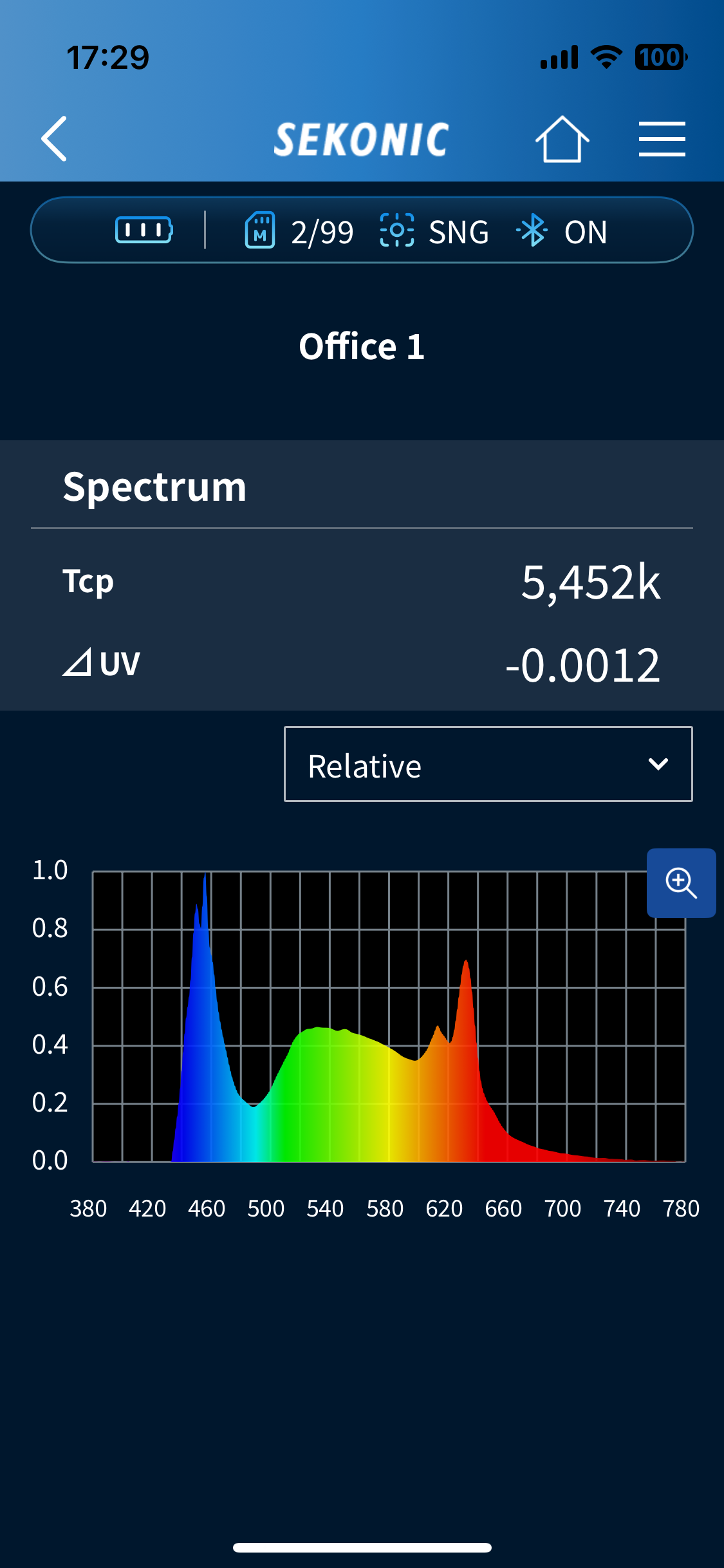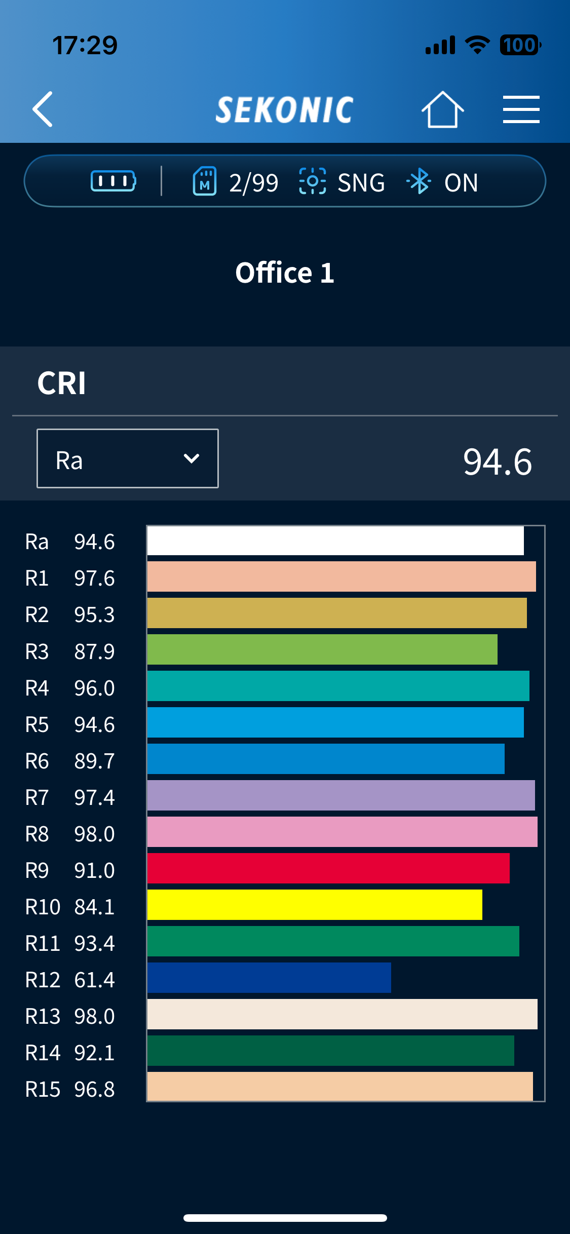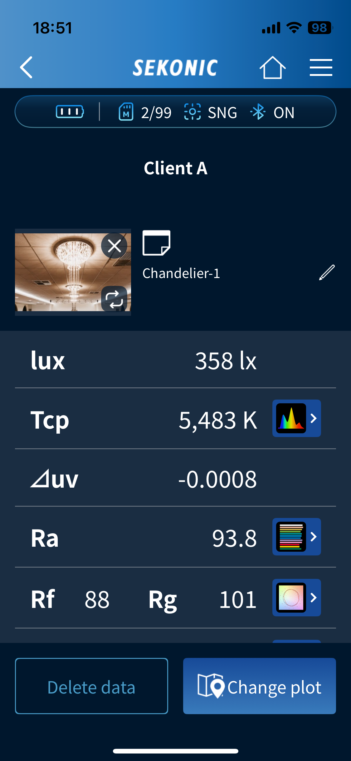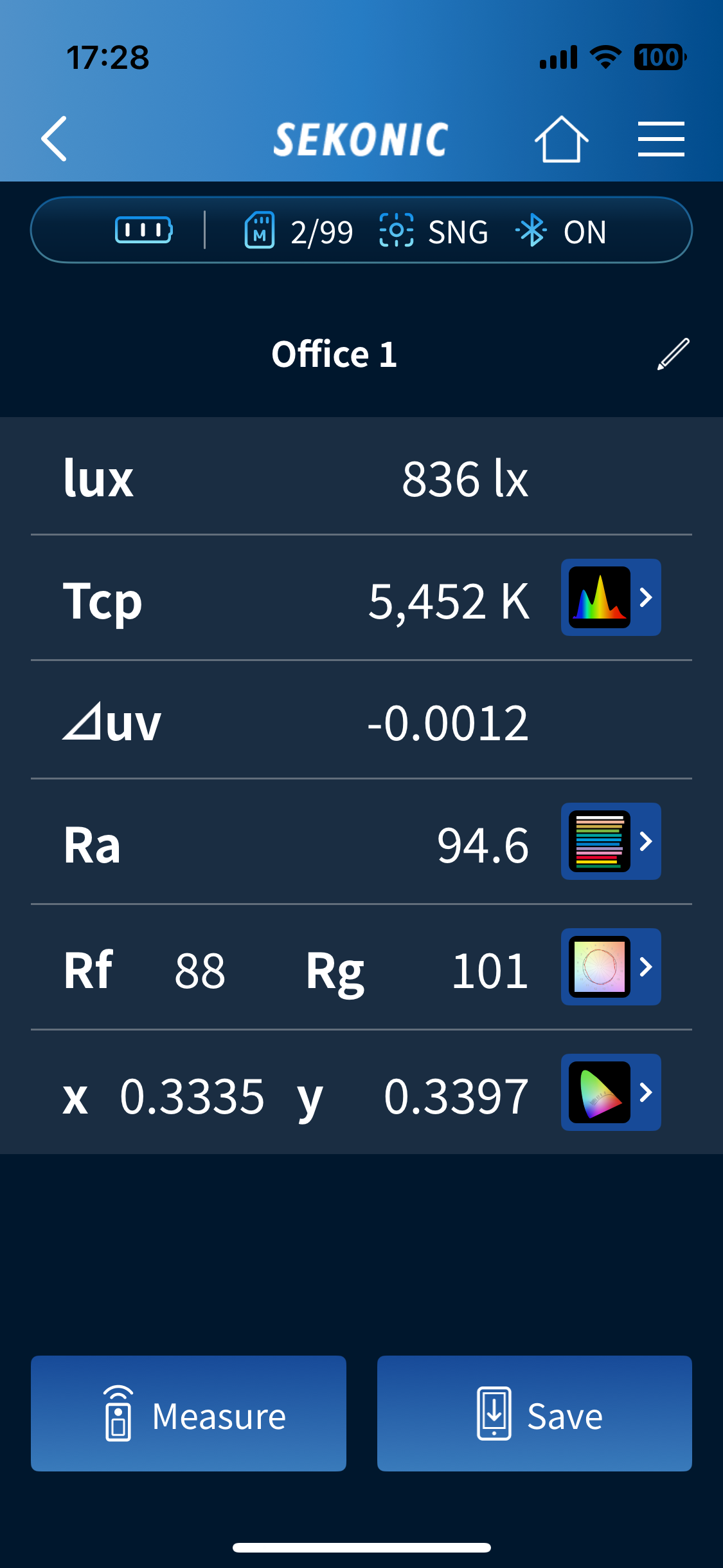 - Provides light quality information such as Ra, ∆uv, Lux/fc, TM-30-18 (Rf, Rg), Chromaticity coordinates (x, y) and more